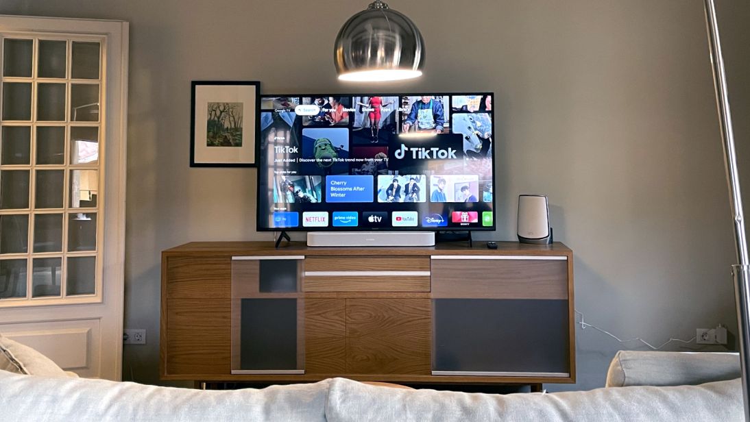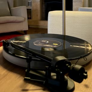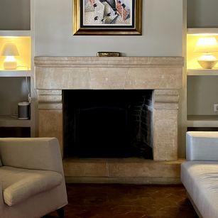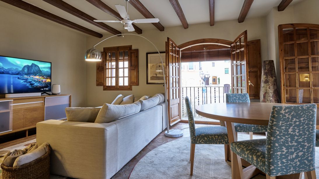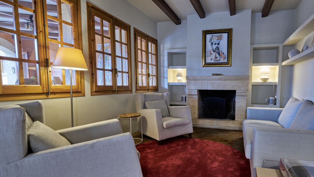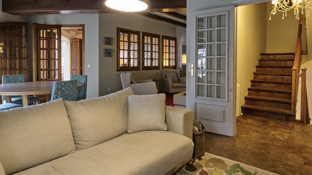 The living room offers multiple possibilities: There is a corner for a movie or game night, a round table for gathering, and a perfect place for reading or listening to music by the fireplace.